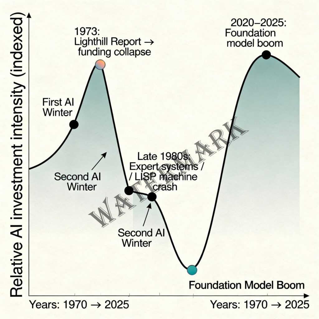 But conflating impressive language generation with understanding, or pattern matching with reasoning, or scaling curves with guaranteed progress toward general intelligence—these errors echo across fifty years. The winter of 1973-1980 wasn’t inevitable. It resulted from overpromising, underfunding verification research, and dismissing critics as Luddites.