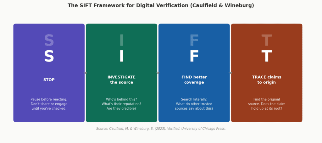 The academic researcher who has perhaps thought longest about the cognitive skills required to navigate this shift is Sam Wineburg of Stanford, co-founder of the Digital Inquiry Group. His research identifies lateral reading — the practice of leaving a source immediately to search for what other trusted sources say about it — as the core skill that expert fact-checkers use. His SIFT framework operationalizes this for learners. Wineburg describes SIFT as standing for “Stop, Investigate, Find a better source, Trace back to the original,” noting that many people skip “stop,” the first step (Wineburg, 2024).