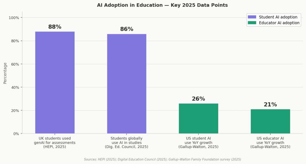 Figure 4. AI adoption in education — key 2025 data points. Student adoption outpaces educator comfort levels, creating a governance gap that provenance literacy can help close.