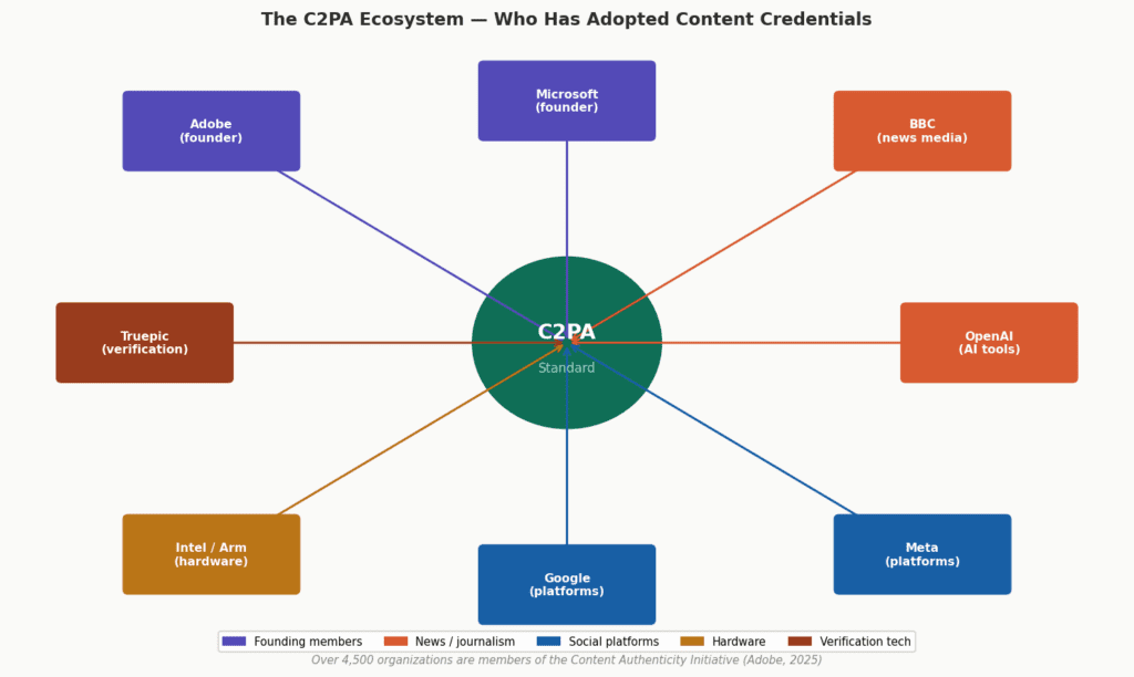 The momentum behind this standard is real. BBC News has implemented Content Credentials. OpenAI announced support for images generated by DALL·E 3. Meta announced plans to build on the C2PA standard across Facebook, Instagram, and Threads. Google joined the C2PA steering committee. By 2026, Content Credentials are embedded in the production pipelines of the internet’s largest platforms (Adobe Blog, 2024).